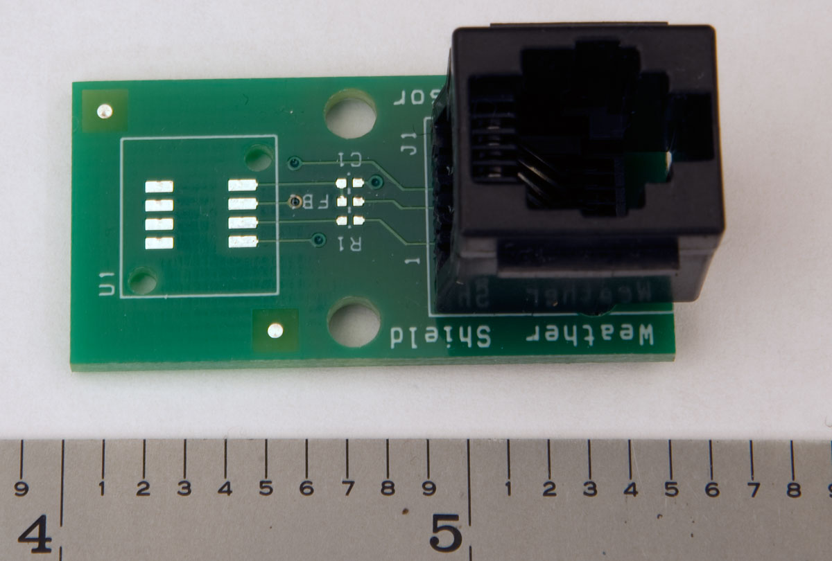 RJ14 jack it is about 3/4 inches high. On the left side you can see the pads for soldering the SHT15 sensor
